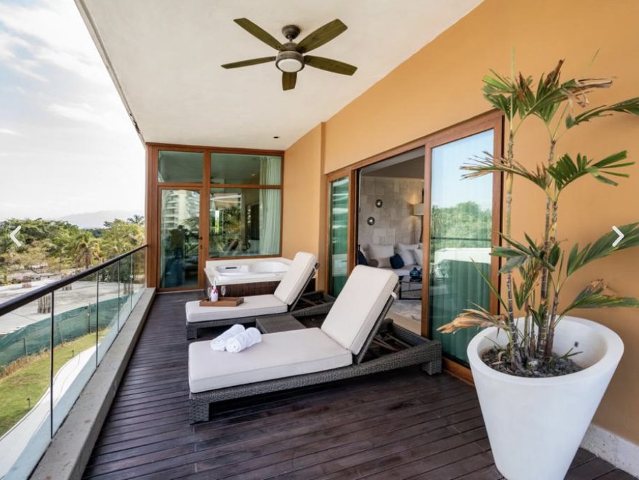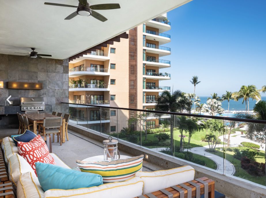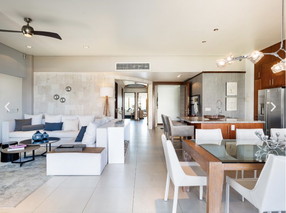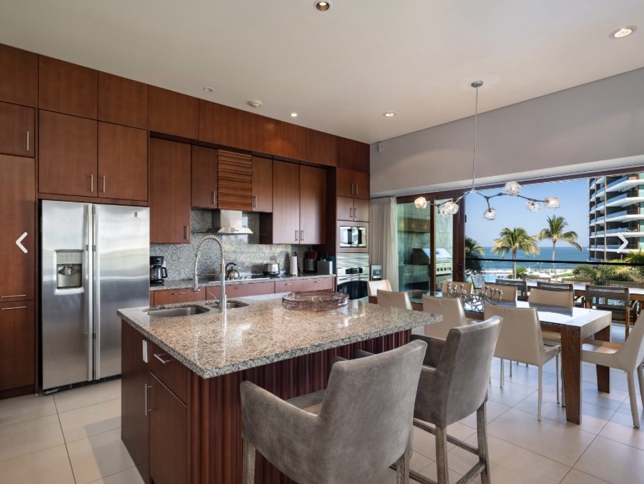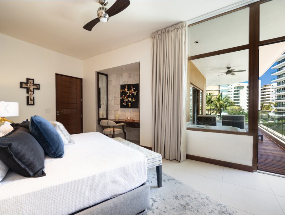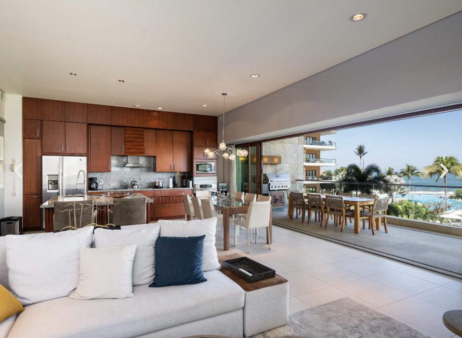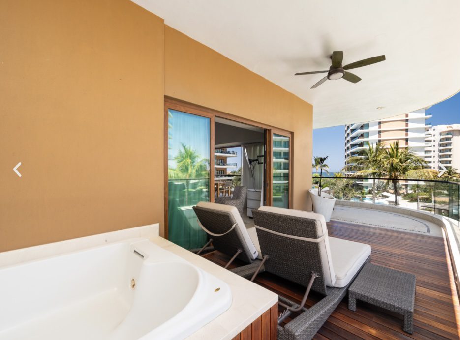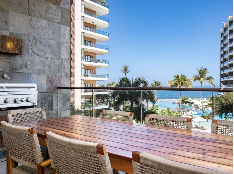 Amplio departamento ubicado piso 3 en esquina de la Torre 2 que ofrece vistas a las espectaculares albercas infinity y a la mejor playa de la bahía. Cuenta con techos de 3.15 m. de alto, amplias terrazas que se integran con el interior. La cocina es de la elegante marca Quetzal con madera de alder.